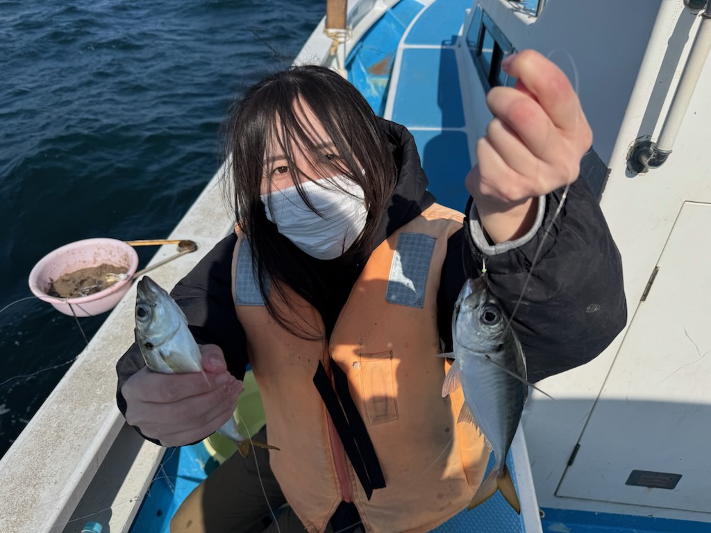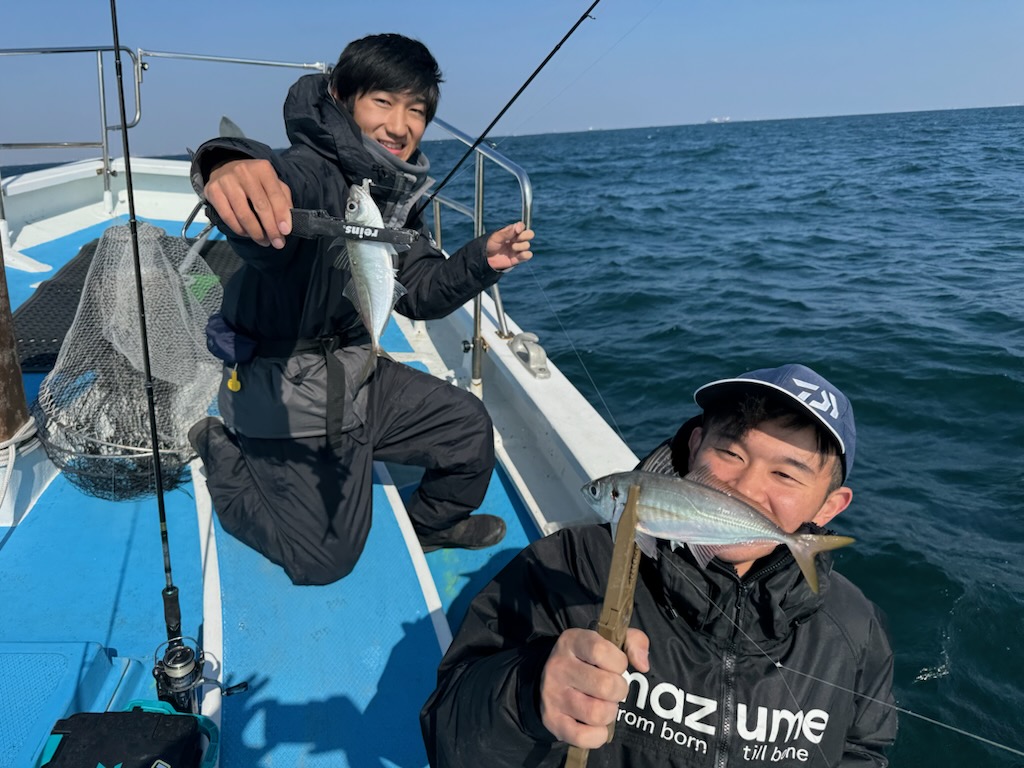 【マアジ船】 マアジ 大きさ 16~27㎝ 数 12~61匹 竿頭 江東区 大艸 孝典さん 今日は木更津沖からスタートしました。コマセが効いてくるとダブルも連発し、好調な食いっぷりも20cm以下の小ぶりが多め。なかなか良型が混じらず、ひと通り釣ったところで富津沖まで南下。こちらも順調な食いでしたが、サイズは20cm前後は掛かってくるも、良型はまじらず・・。後半は深めのポイントに移動。じっくりと狙っていると25cm前後の良型がポツポツと!帰り際にかけてデカアジそろいで楽しめました!