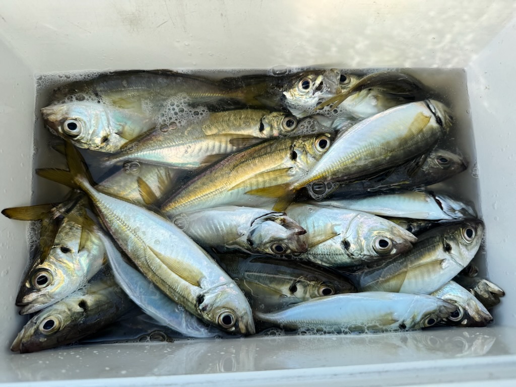 【マアジ船】 マアジ 大きさ 16~28㎝ 数 52~99匹 竿頭 江東区 川島 勉さん 今日は扇島沖から開始。浅場のポイントでレクチャーしながら始めると、いきなり20cm前後のアジが活発な食いっぷりに!慣れない方々もダブルを連発し、桶の中もアジで埋まっていきました!ただ、時間の経過とともに小ぶりが優勢に。ポイントを移動しストラクチャー周りに。こちらは20~25cmの良型でそろいコマセが効いてくるとまたまた活発に!皆さんお土産分はバッチリになったところで、帰り際に気になるポイントによると、またまたこちらでもバリバリと!サイズも良く、今日は上手くハマれてクーラーも満タンになりました!