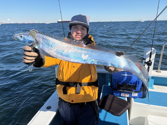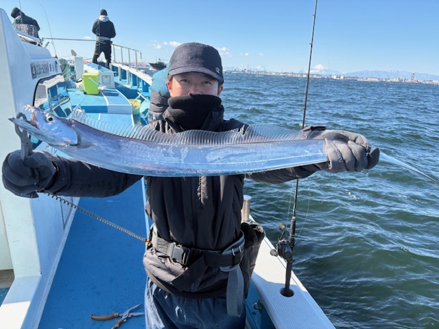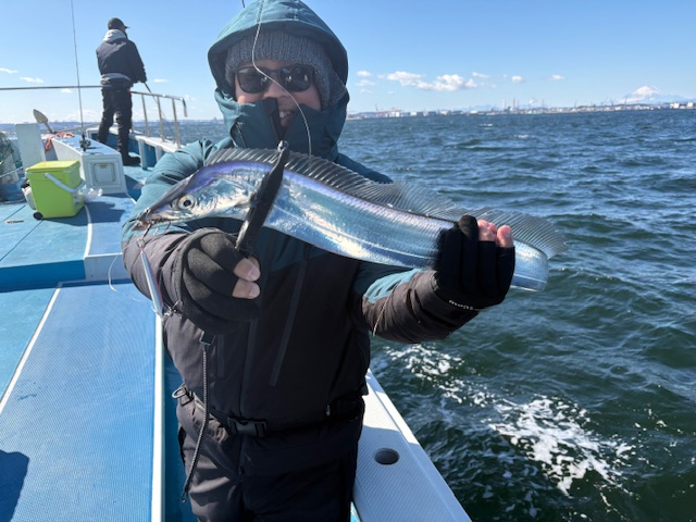 天気 雲→雪 水温10.2℃ うす濁り 【タチウオ船】 タチウオ 大きさ 80~117㎝ 数 1~23匹 竿頭 足立区 大竹 和也さん 今日は朝から雪の降りしきる中の出船となりました。南下するほど北風も吹いていたので、今日は昨日模様のあった湾奥の1本勝負!途中、降雪が激しくなるとストラクチャー周りで避難したりと、いつもより安全確保に努め、ポイントを捜索。海底付近に反応も点在しておりジグを落とすとポツポツとHIT!サイズも良くメーター前後の良型主体!細いのは数匹掛かってきた程度で湾奥の肉厚&極太サイズでそろいました!極寒の中、頑張ってもらい皆さんGET!後半は風も強まってくるようでしたので、13時すぎに帰航となりました。明日も湾奥のポイントに向かいます!60g前後の軽めのジグもお忘れなく!