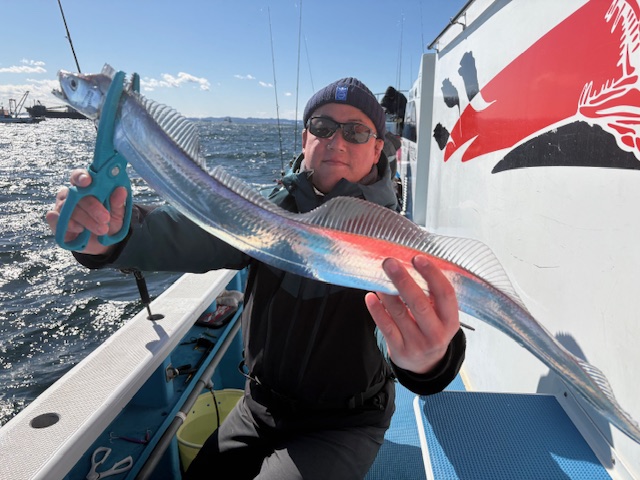 天気 晴れ 水温10.0℃ うす濁り 【タチウオ船】 タチウオ 大きさ 80~118㎝ 数 9~37匹 竿頭 渋谷区 横山 秀之さん 今日も昨日に引き続き、湾奥のポイントから開始。20~30mほどと浅場に反応も点在!朝イチは活性も高めで、ジグを落とすとメーター前後の良型主体に順調にアタリが出せました!その後もあて変える度にポツポツと続いてくれ、海底から10mほど反応も持ち上がってくると、入れ食いに近いアタリっぷりに! 極寒の2月ですが今後は湾奥で、もうひと盛り上がりありそうです!!