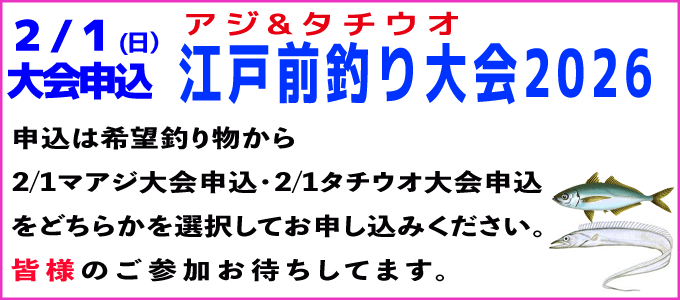 12/1(月)10:00AMになりましたら、予約フォームの希望釣り物に、2/1マアジ大会申込・2/1タチウオ大会申込のボタンを設置しますので選択してお申し込みください。2名様以上で参加希望の場合は、備考欄に必ず同行者のフルネームと連絡先電話番号を記入してください。メールを確認次第、大会申込の完了メールをいたします。