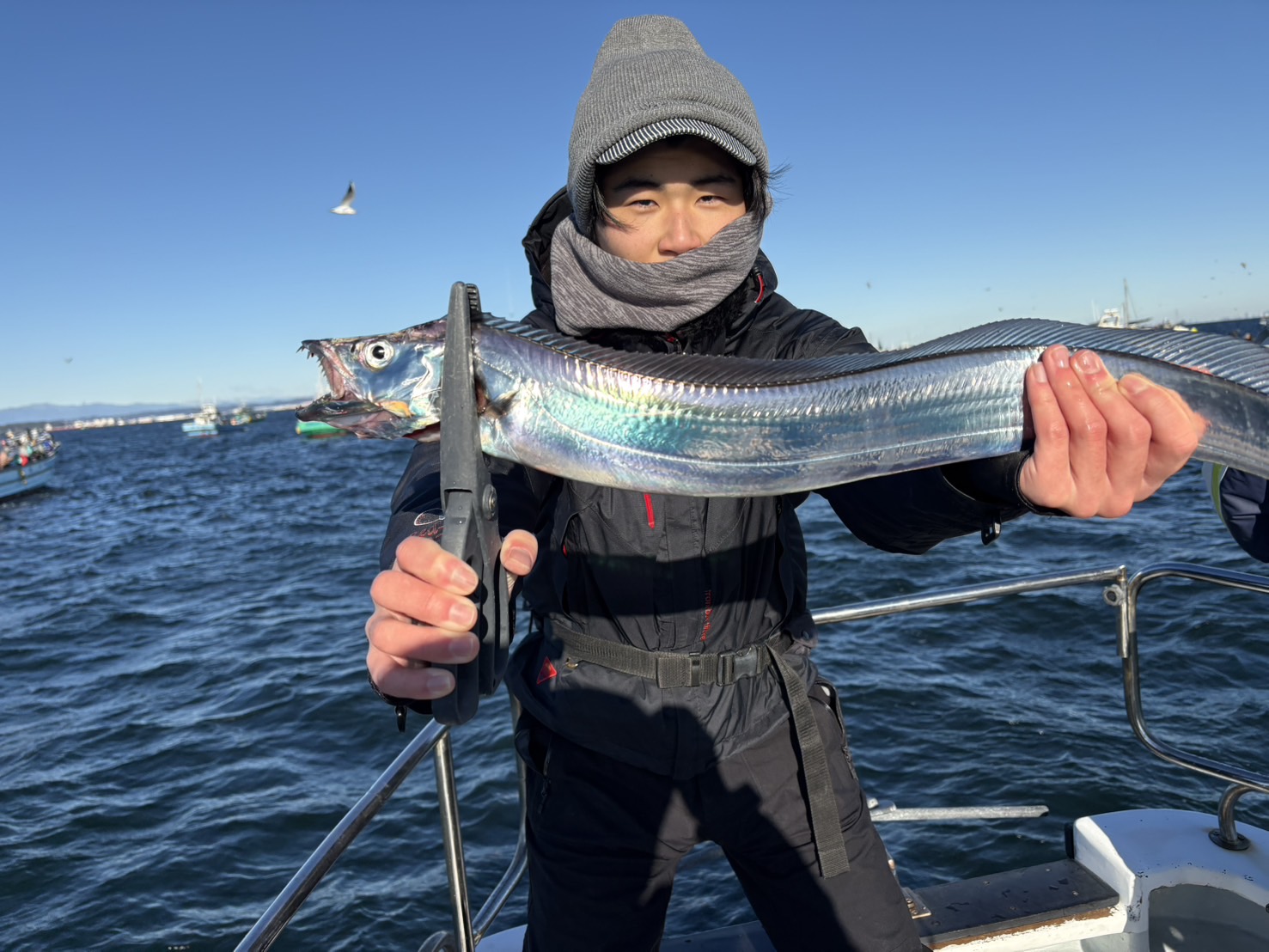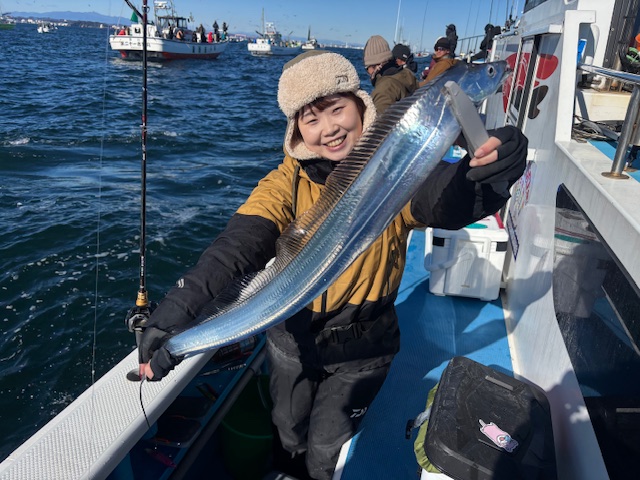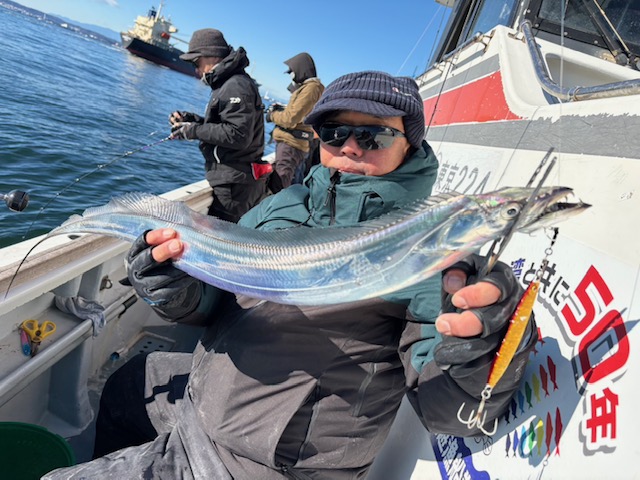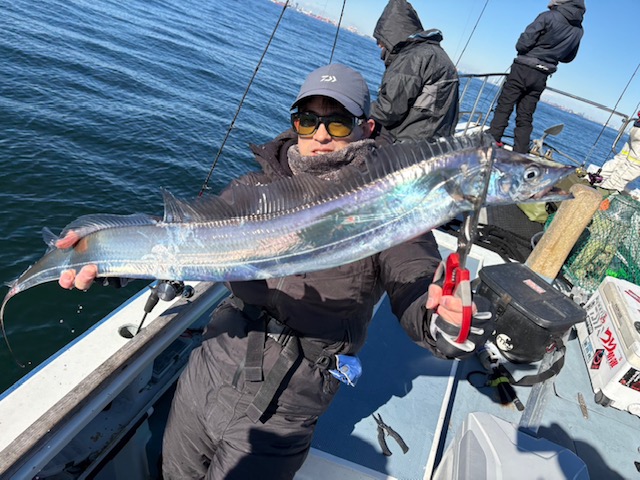 天気 曇→晴 水温13.5℃ うす濁り 【タチウオ船】 タチウオ 大きさ 75~114㎝ 数 1~13匹 竿頭 江東区 小浜 健司さん 今日も観音崎沖からスタートしました。午前中は反応も広範囲に出ており、ポツポツとアタリも順調な感じ!ただ、潮止まりから上げ潮の変わると活性もダウンしたのか、かなりのテクニカルモードに・・。フォール時にチップするだけのアタリを取れるか否かで釣果に差が出てしまう感じでした・・。 反応はバッチリと出ております!休み明けには活性高まってくれることに期待しましょう!
