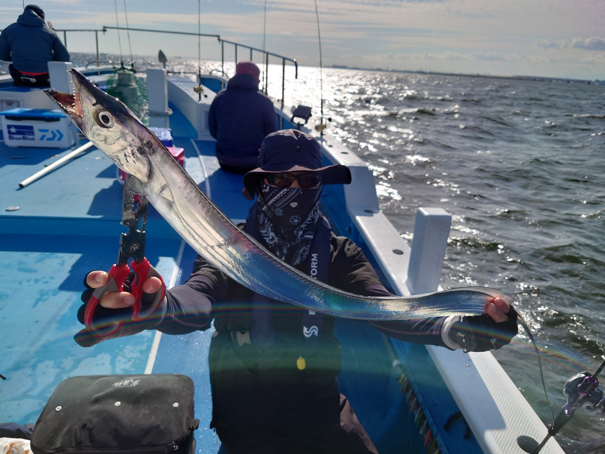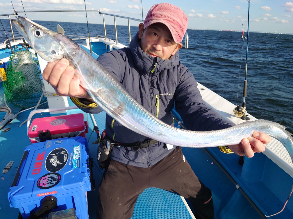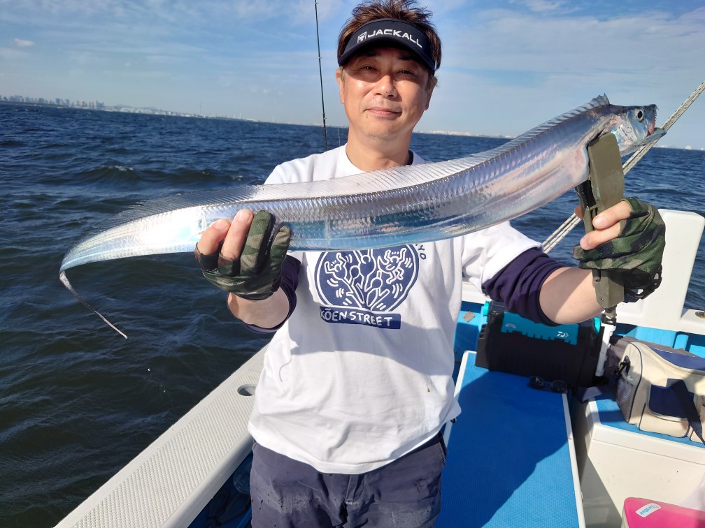 【タチウオ船】 タチウオ 大きさ 75~107㎝ 数 6~36匹 竿頭 松戸市 高木 祥行さん タチウオ船は近場のポイントを捜索しながらスタート。湾奥の奥の奥の方まで捜索するも収穫は無し・・。木更津沖まで南下するも止まれずに西側のポイントまで移動。ここでようやくしっかりとした反応に遭遇!じっくりと狙いこんで、パターンをつかんだ方々は連チャンモードに!短時間で20匹ほど釣り上げた方も!アタリが遠のくとまた湾奥のポイントに。こちらはちょっとサイズもUP!流し変えの度にポツポツと追加できました!