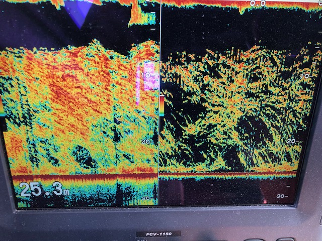 日によって群れが表層近くに浮いている場面も。今後はスピニングタックルにスピンテールジグやバイブレーションなどもお忘れなく!