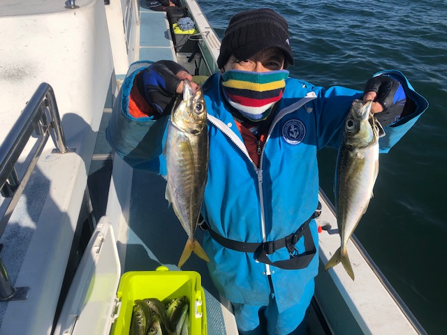 【マアジ船】 マアジ 大きさ 15~44㎝ 数 1~50匹 竿頭 文京区 安田 健一郎さん アジ船は近場のポイントから捜索しながら回るも、なかなかいい反応が見当たらず・・。転々としながらようやく活性の良さそうな反応に遭遇!コマセが効いてくると25cm前後の良型主体に好調にHIT!小ぶりも交らず続いてくれました!ちょっとサイズUPをもくろみ沖目に移動。35cmを超える大型がポツポツと!最大は44cmも浮上するも、バチコンの方は上手くハマれず1匹と残念でした・・。