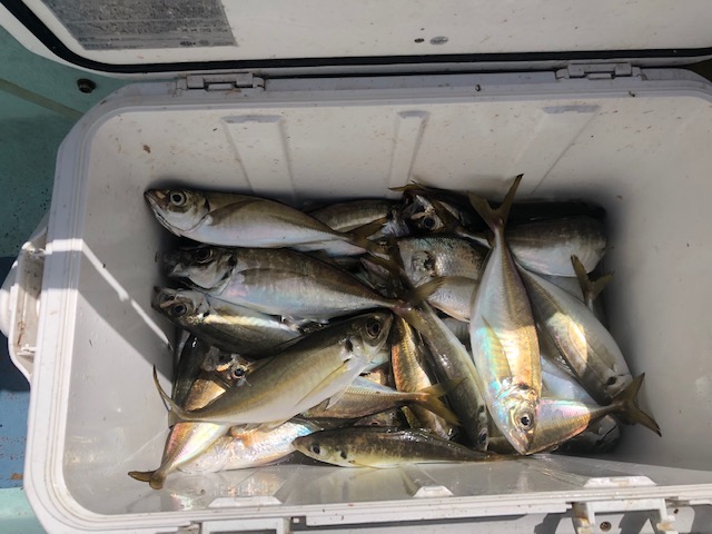 アジ船はストラクチャー周りから捜索するも、反応見当たらず・・。転々と探りながら南下し、いい反応があるポイントもありましたが、型を出す程度・・。ようやく扇島沖でいい群れに遭遇!コマセが効いてくると慣れている方はダブル連発でいい感じに!途中まったりする時間帯もありましたが、またまた好調にアタリが出せ、サイズも良型主体!イシモチも多数交りお土産は確保できました!