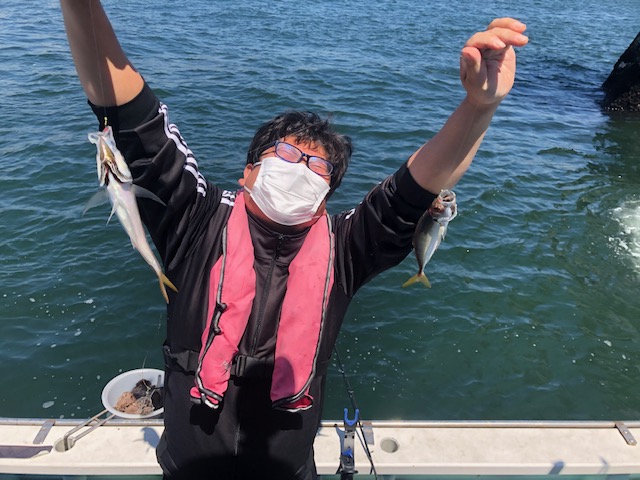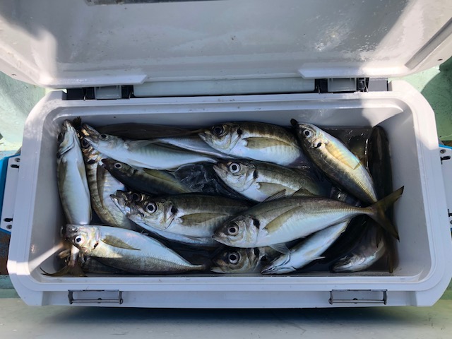 久しぶりのアジ船でした。近場のポイントから順に狙っていくも、どこも反応はしっかりと出ているのですが、なかなかアタリが出せず転々と移動。時間も気が付けば10時と船内にヤバい雰囲気が漂い始めた頃に、優しい大先輩が声をかけてくれ、すぐに合流!反応はしっかりと出ており、コマセが効いてくるとポツポツと好調にHIT!タナは3・4mとちょっと浮かんでおり、しっかりと合わせ誘わないとアタリが出せない様子。慣れた方は入れ食い状態になりましたが、慣れない方はちょっと見物状態になってしまいました・・。
