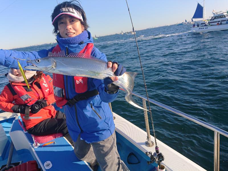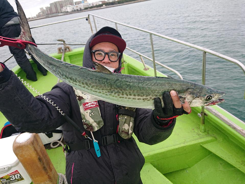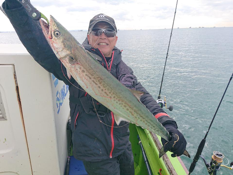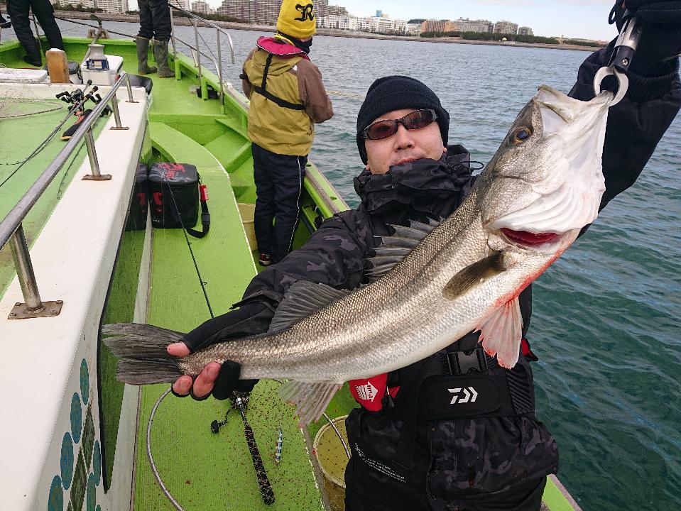 朝一はベイト反応にタチウオとイナダの群れが付いているようで、流しかえのたびにポツポツと順調にHIT。アタリが落ち着いて来たところで千葉側のポイントに。こちらは大鳥山が立っており、ジグを落とすとシーバスが活発にHIT!40cm級が多めも、時折60UPもポツポツとHIT!最大は75cmの大型も!シーバスの群れにまじりサワラもHIT!バラシも目立ちましたが、なんとか2匹をGETできました。