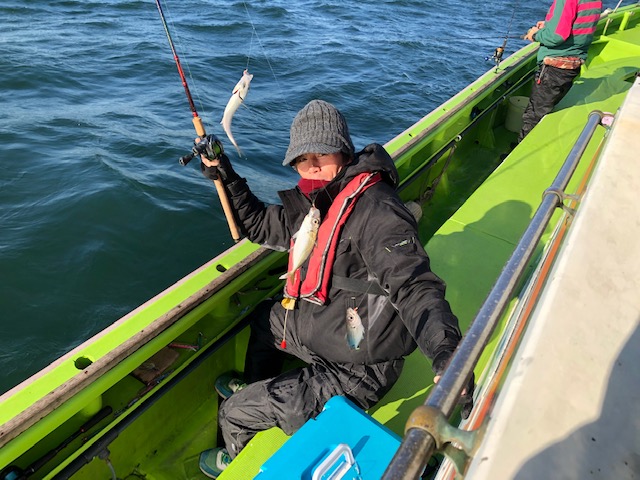 今日は2隻で出船しました。昨日好調だったポイントに直行するも、網で巻かれてしまったのか、ショボ目の反応しかなく型を見た程度・・。各ポイントを転々と探るも、昨日より水温も低下したせいかベイト反応も見当たらず・・。後半は根回りのポイントで、ジグに食らいついてくる魚なら何でもいいと狙っていましたが、なかなかアタリは遠く。ジギングサビキで狙っていた方は良型のアジが15匹ほど釣れていました。