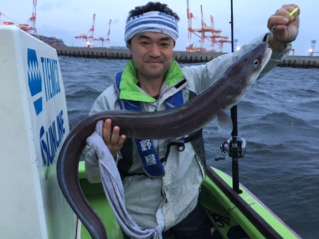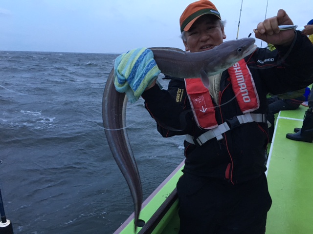 クロアナゴ船も強風の中出船となりました。ただ、狙っているポイントは思いのほか波はなく、釣りは出来る感じ!アンカーを入れじっくり待っていると最初の1匹目が掛かると、夕まづめのラッシュが!バタバタっとHITし船内も盛り上がりました!暗くなってくるとアタリも遠のき・・。風も増してきて釣りを中断してしまう方も増えてきたので、後半は風影に避難。ここは過去に実績はあるもの今季初狙いましたが、いきなり連発でHIT!その後もポツポツ掛かってきて帰り際まで続いてくれました!