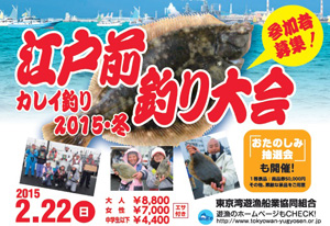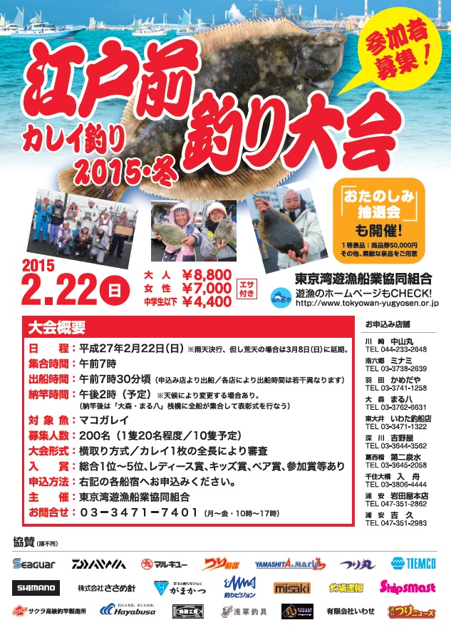 東京湾遊漁船業協同組合主催!真冬の熱い熱い競技会『第11回・江戸前釣り大会~カレイ2015~』を2月22日(日)に開催いたします。今大会も沢山の企業様よりご協賛いただき、また好評の「お楽しみ抽選会」もご用意しております!