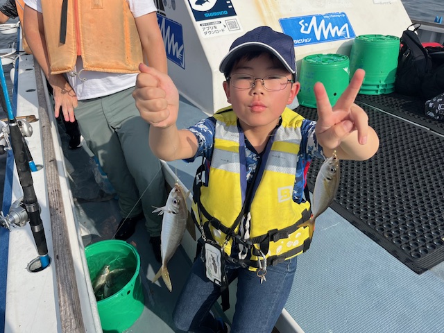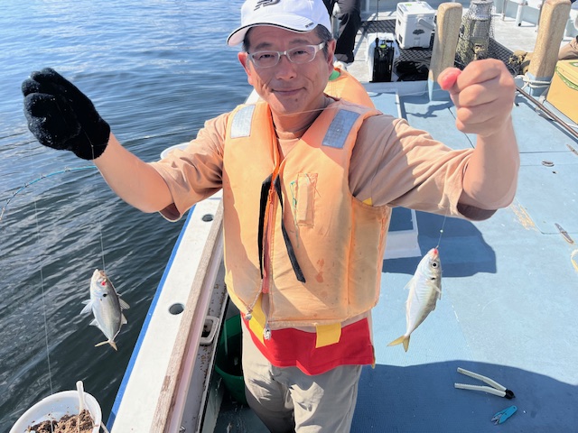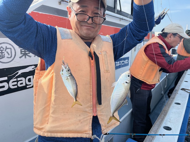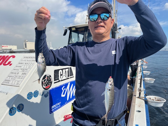 【マアジ船】 マアジ 大きさ 18~28㎝ 数 26~90匹 竿頭 千代田区 鳥海 智史さん 朝イチは扇島沖から開始。しばらく捜索しようやく反応が見つかり、コマセが効いてくると活発な食いっぷりに!慣れない方もダブルを連発!たまに良型もまじってくのでじっくりと狙いました!後半になり、皆さんお土産分はバッチリと確保できたところで、沖目にサイズUPをもくろみ移動しましたが、追加はできませんでした・・。