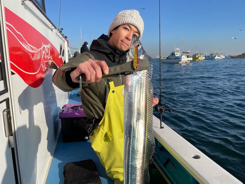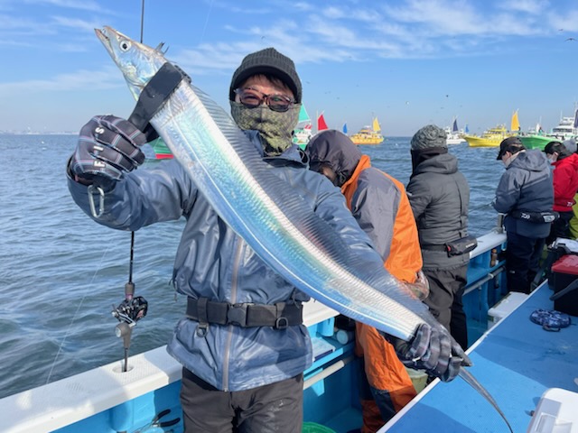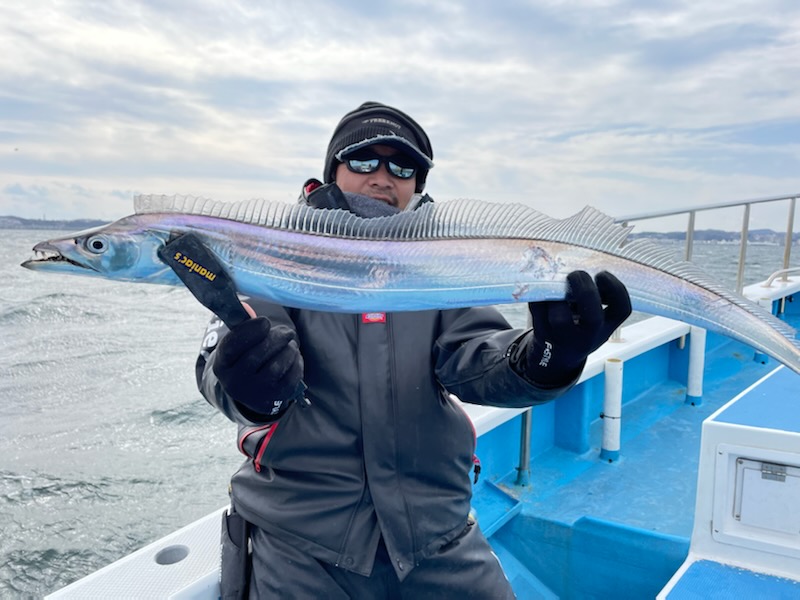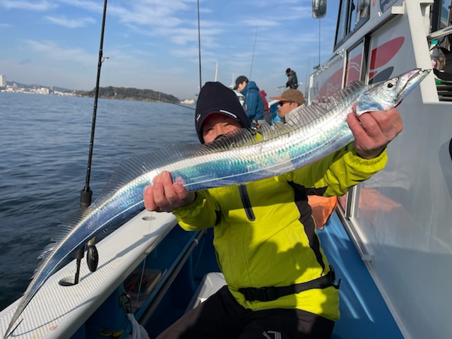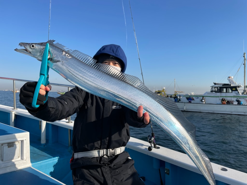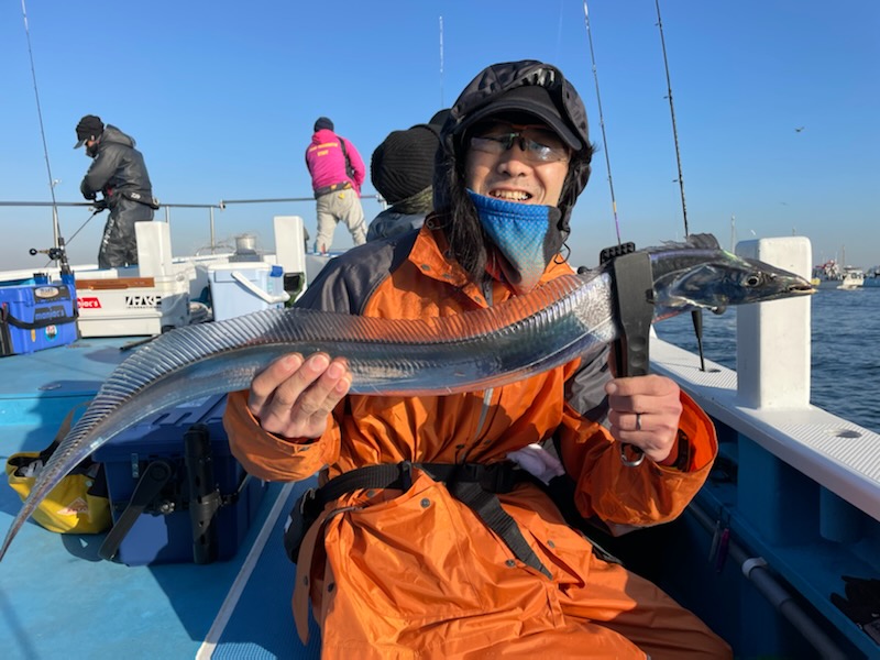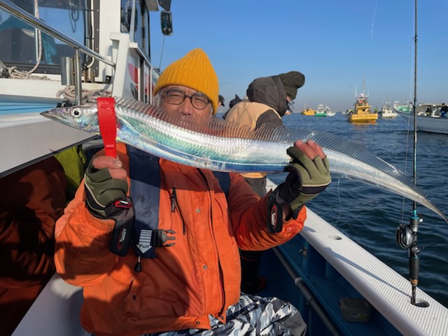 【タチウオ船】 タチウオ 大きさ 80~117㎝ 数 0~15匹 竿頭 松戸市 高木 祥行さん 今日はゆったりと2隻で出船しました。ともに猿島沖からスタート。朝方はまだ北風で、メーターUP交じりでポツポツと好調にHITしてくれましたが、南西の風に変わり強めに吹き込んでくると、反応も浮いたり沈んだりと落ち着かなくなってきて・・。アタリっぷりもイマイチな感じになってしまい、船酔いで0匹の方も・・。後半は苦戦気味でした・・。