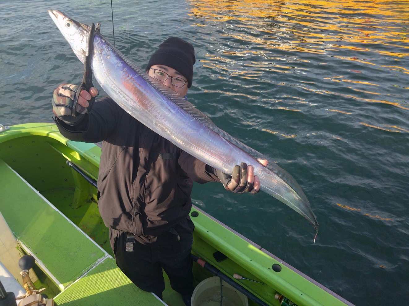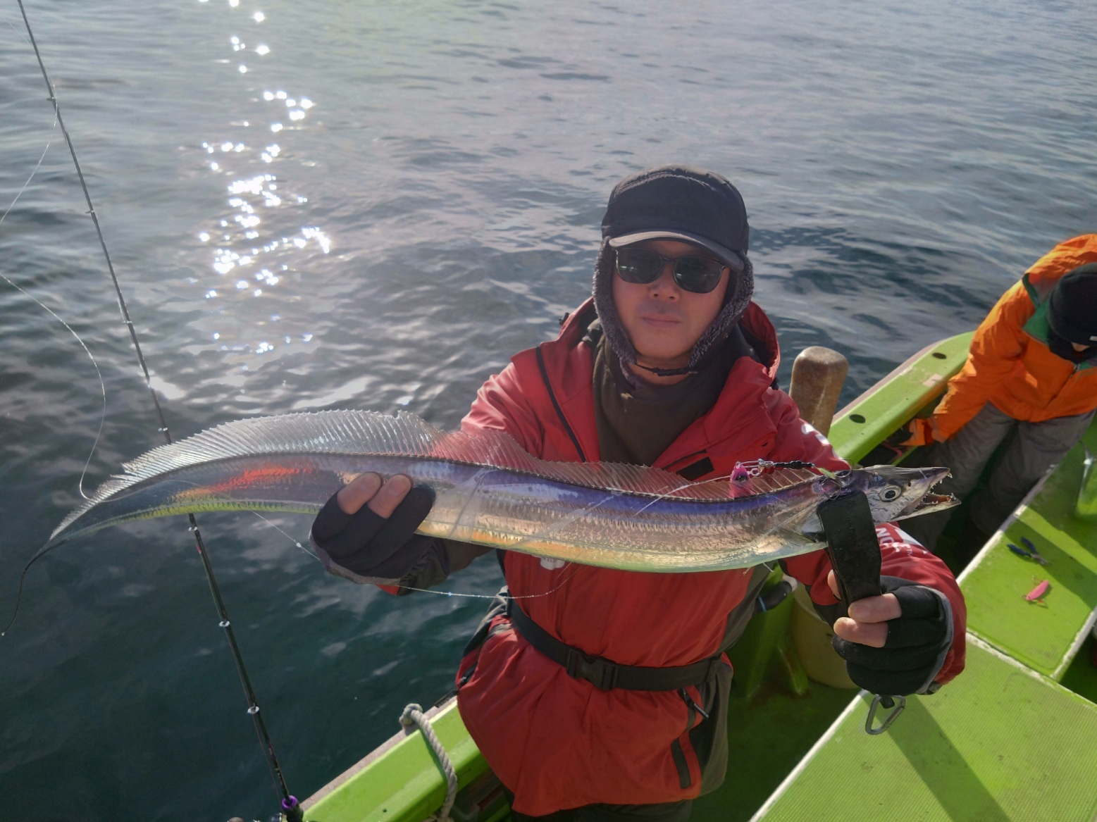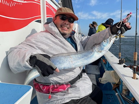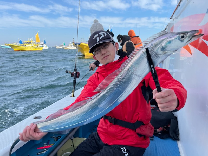 【タチウオ船】 タチウオ 大きさ 80~117㎝ 数 0~15匹 竿頭 松戸市 高木 祥行さん 今日はゆったりと2隻で出船しました。ともに猿島沖からスタート。朝方はまだ北風で、メーターUP交じりでポツポツと好調にHITしてくれましたが、南西の風に変わり強めに吹き込んでくると、反応も浮いたり沈んだりと落ち着かなくなってきて・・。アタリっぷりもイマイチな感じになってしまい、船酔いで0匹の方も・・。後半は苦戦気味でした・・。